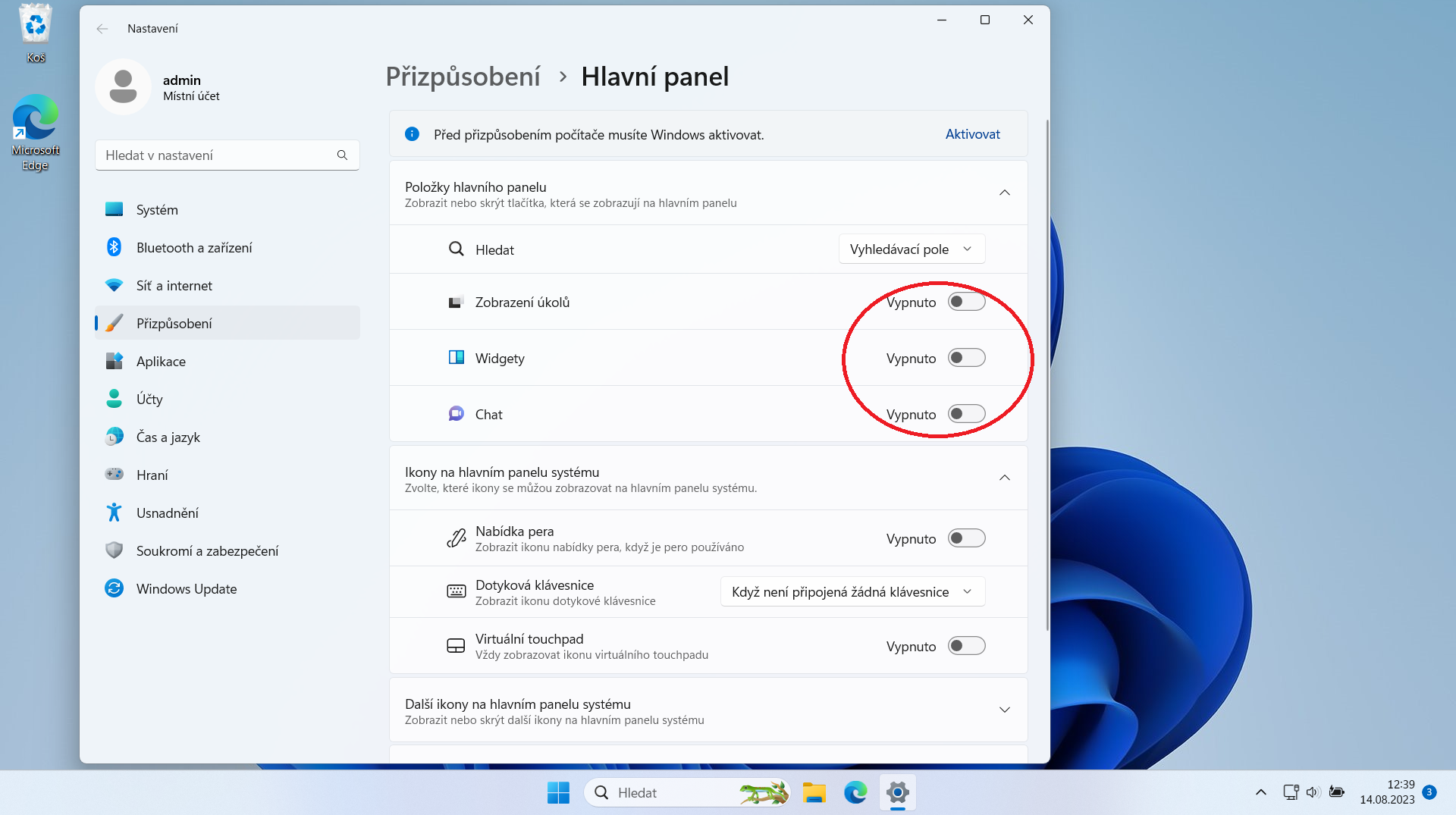 Konzervativnímu uživateli je vhodné nová Windows trošku přizpůsobit. Vypnout na hlavním panelu (to je ten spodní řádek) položky: Zobrazení úkolů, Widgety a Chat. Přesunout tlačítko Start doleva, a vložit na plochu známé zástupce Tento počítač a Ovládací panely.