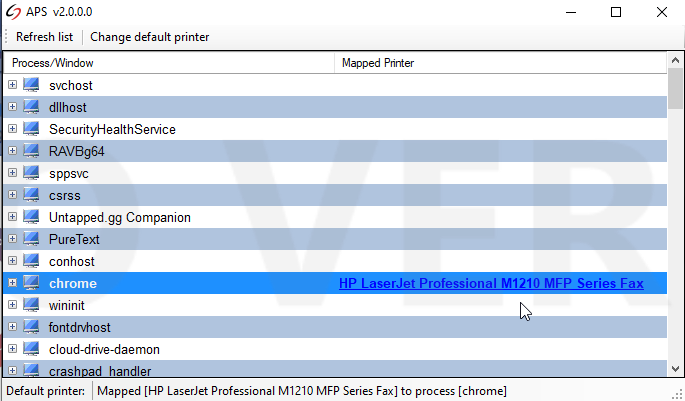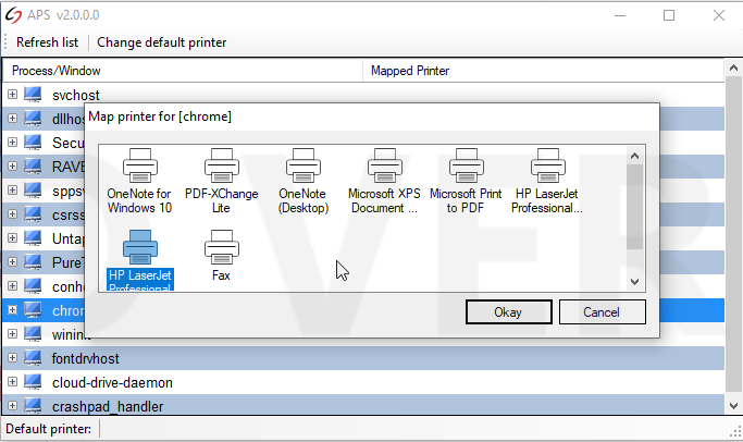 Instalace programu je velmi jednoduchá. Po jeho spouštění klepněte by seznamu by se měla zobrazovat všechna spuštěná okna, resp. aplikace. Označte tedy jedno z nich, pravým tlačítkem vyberte z kontextové Edit mapping a vyberte příslušnou tiskárnu.