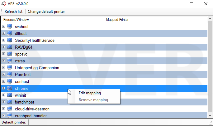 Instalace programu je velmi jednoduchá. Po jeho spouštění klepněte by seznamu by se měla zobrazovat všechna spuštěná okna, resp. aplikace. Označte tedy jedno z nich, pravým tlačítkem vyberte z kontextové Edit mapping a vyberte příslušnou tiskárnu.